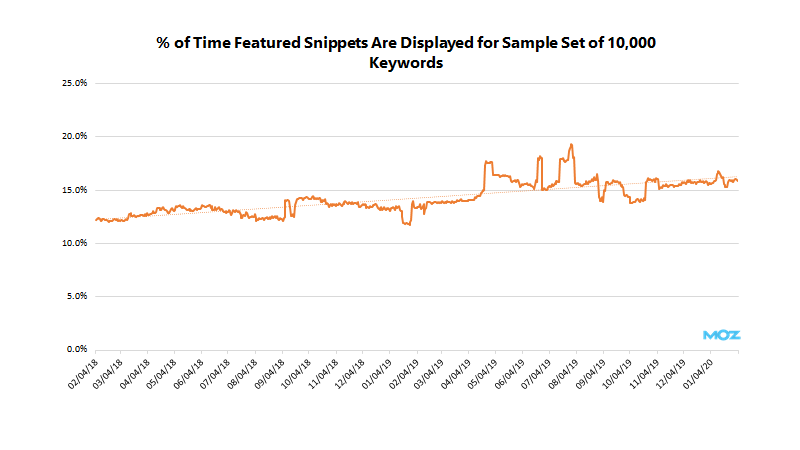 According to data pulled by Dr. Pete Meyers, based on a sample set of 10,000 keywords, Google has increased the frequency with which it displays Featured Snippets as part of the search results. In the beginning of 2018, Google displayed Featured Snippets in approximately 12% of search results; in early 2020, that number hovers around 16%.