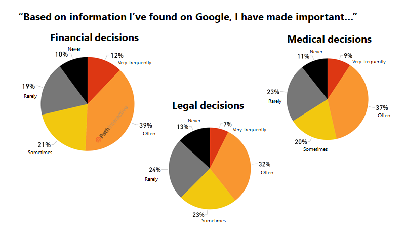 We started by asking respondents about the extent to which they have made important financial, legal, or medical decisions based on information they found in organic search. The majority (51%) of respondents indicated that they “very frequently” or “often” make important life decisions based on Google information, while 39% make important legal decisions, and 46% make important medical decisions. Only 10-13% of respondents indicated that they never make these types of important life decisions based on the information they’ve found on Google.