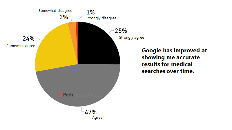 As it relates to medical searches, 72% of users agree or strongly agree that Google has improved at showing accurate medical results over time.
