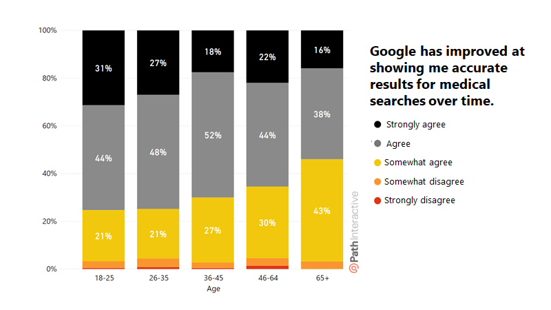 - 75% of the youngest searchers (ages 18-25) agree or strongly agree that Google has improved in showing accurate medical searches over time, whereas only 54% of the oldest searchers (65+) feel the same way.