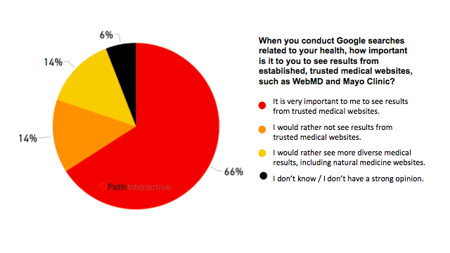 The majority (66%) of respondents agree that it is very important to them that Google surfaces content from highly trusted medical websites. However, 14% indicated they would rather not see these results, and another 14% indicated they’d rather see more diverse results, such as content from natural medicine websites. These numbers suggest that more than a quarter of respondents may be unsatisfied with Google’s current health initiatives aimed at surfacing medical content from a set of acclaimed partners who support the scientific consensus.