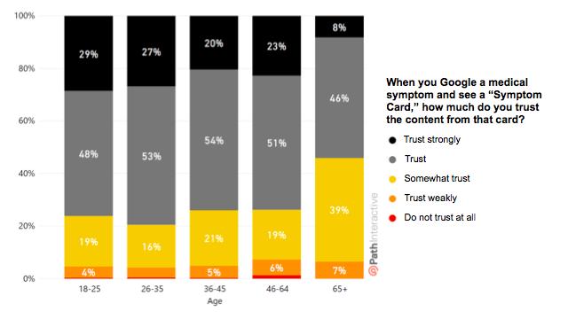- The youngest searchers (ages 18-25) are 94% more likely than the oldest searchers (65+) to strongly believe that Google’s medical results have improved over time.