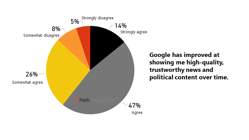 The majority of respondents (61%) agree or strongly agree that Google has improved at showing high-quality, trustworthy news and political content over time. Only 13% disagree or strongly disagree with this statement.