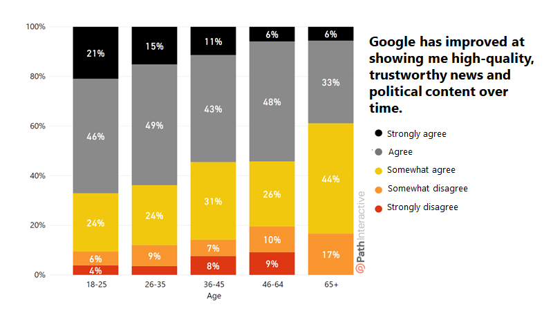 - The youngest searchers (ages 18-25) are 250% more likely than the oldest searchers to strongly agree that the quality of news and political content on Google is improving over time.