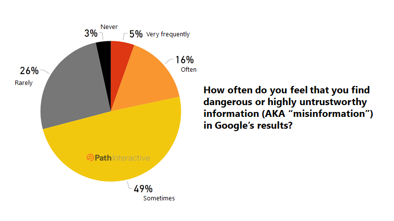 Given Google’s emphasis on combating misinformation in its search results, we also wanted to ask respondents about the extent to which they feel they still encounter dangerous or highly untrustworthy information on Google.