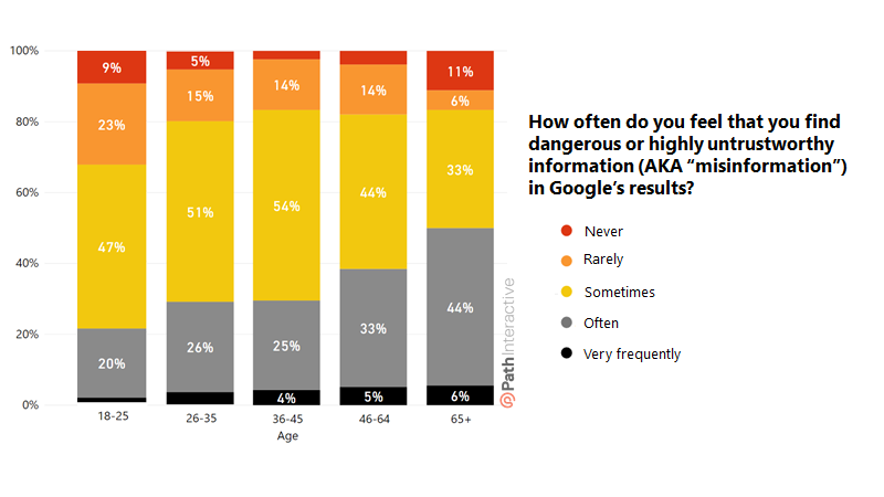 Segmenting the responses by age groups reveals a clear pattern that the older the searcher, the more likely they are to indicate that they have seen misinformation in Google’s search results. In fact, the oldest searchers (65+) are 138% more likely than the youngest searchers (18-25) to say they’ve encountered misinformation on Google either often or very frequently.