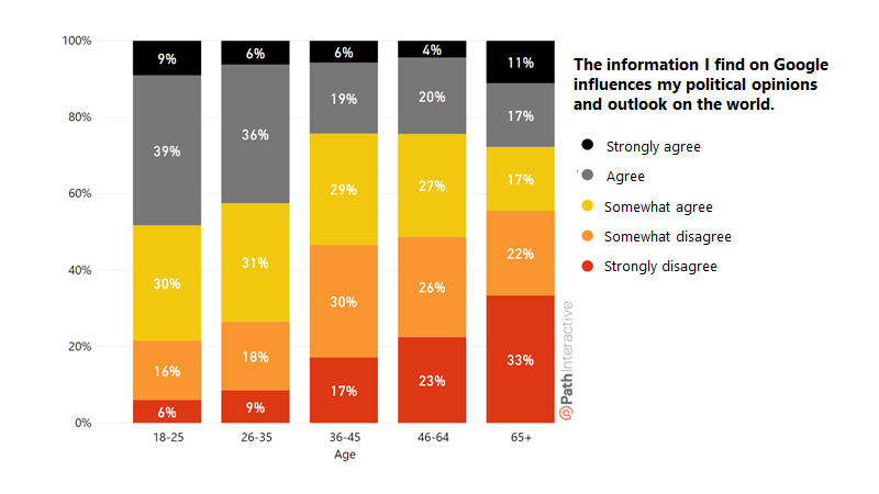 The question revealed some interesting trends related to the oldest searchers: according to the results, the oldest searchers (65+) are 450% more likely than the youngest searchers to strongly disagree that information they find on Google influences their worldview.