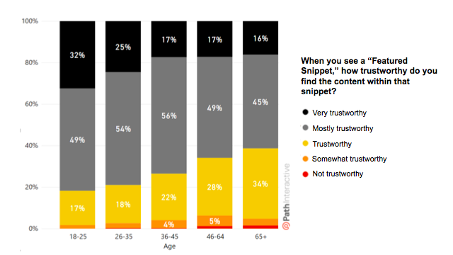 According to the results, the youngest searchers (ages 18-25) are 100% more likely than the oldest searchers (ages 65+) to find the content within Featured Snippets to be very trustworthy. This aligns with a similar discovery we found in our survey from last year: “The youngest searchers (13–18) are 220 percent more likely than the oldest searchers (70–100) to consider their question answered without clicking on the snippet (or any) result.”