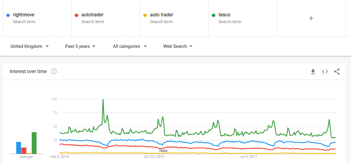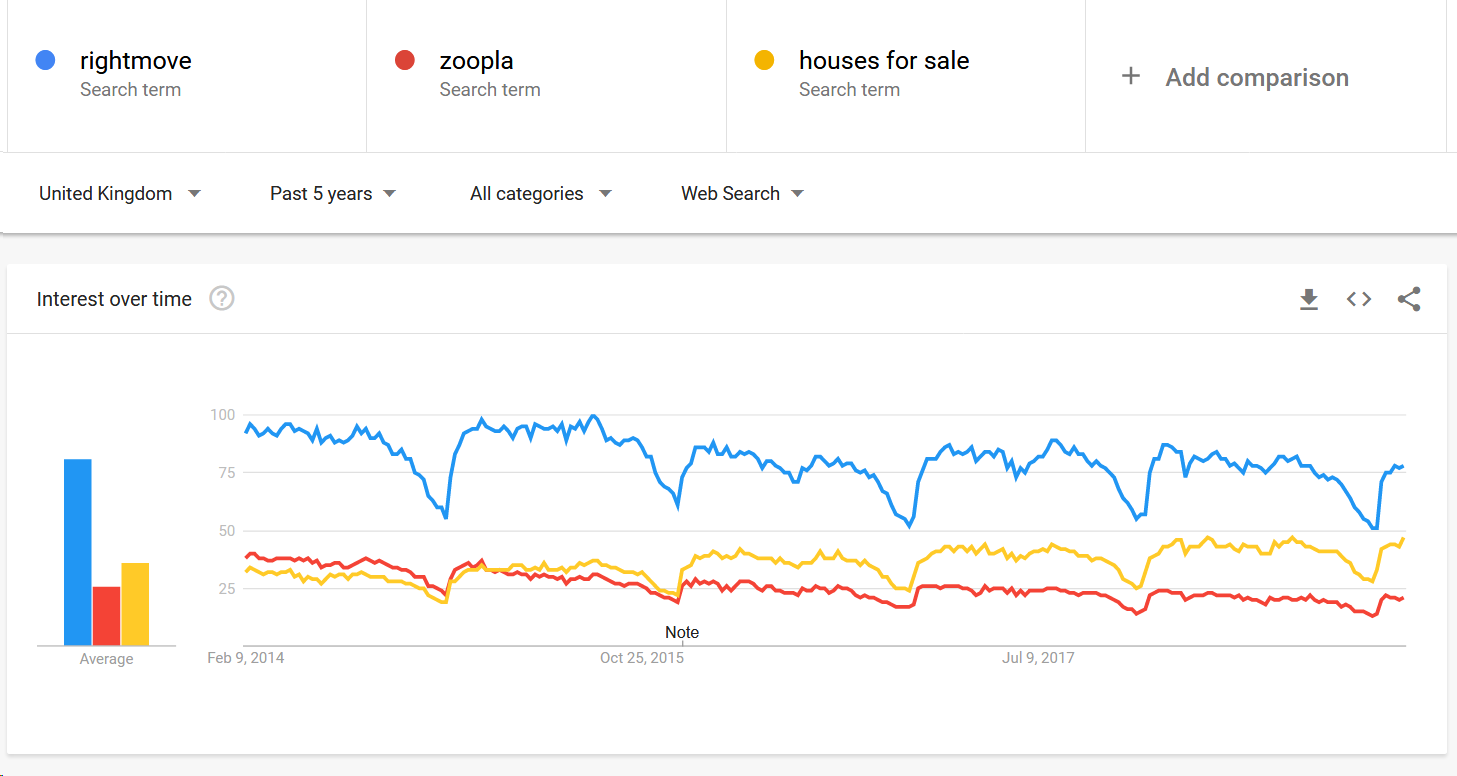 Rightmove and Zoopla are the two biggest brands in this space and have been for some time. There’s only one line there that’s trending upwards, though, and it’s the generic term, “houses for sale.”