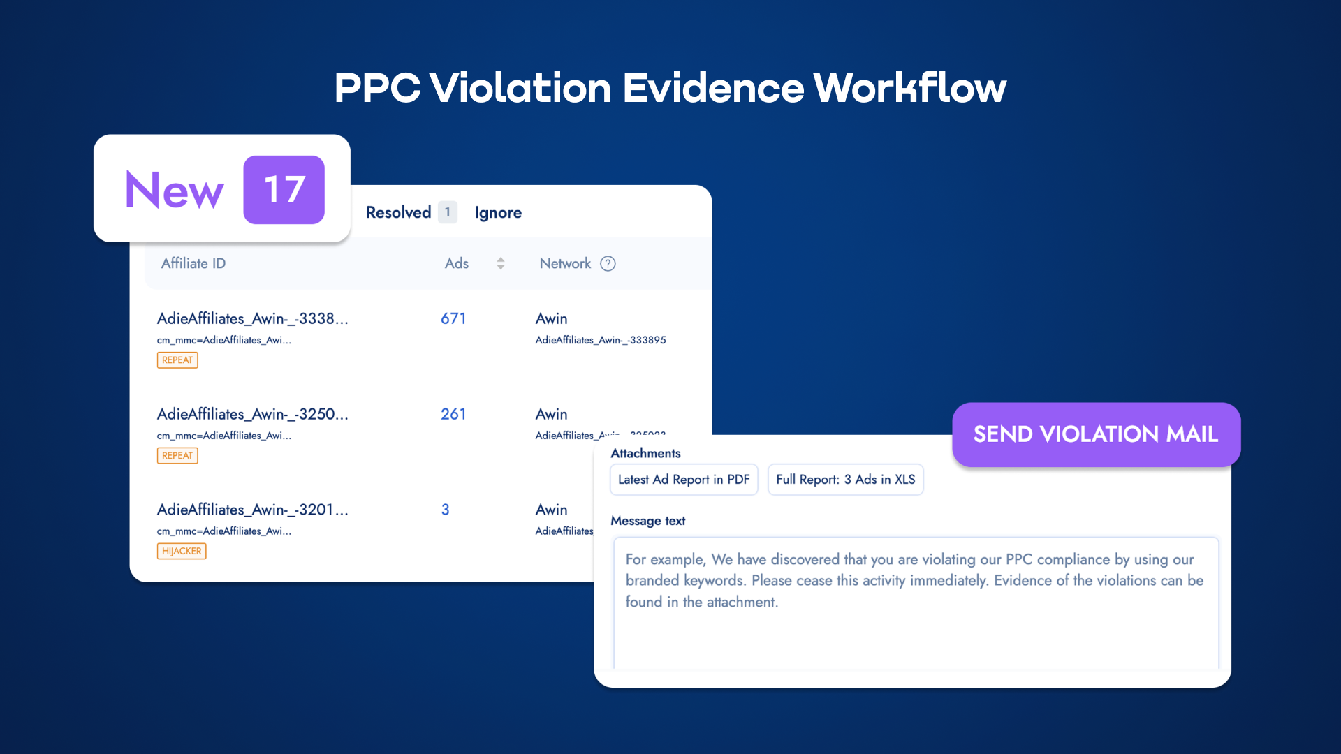 Real-time alerts and dashboards clearly separate competitor and affiliate findings, with transparent case statuses (New, In Progress, Resolved). Compliance teams can react before ad spend is lost — without manual tracking or overnight monitoring shifts.