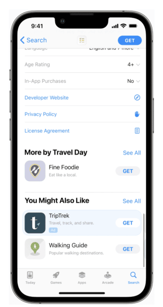 Product pages – while browsing. These ads let you reach people while they browse apps on relevant pages across the App Store, whether their journey started on the App Store or from an outside link. When interested users have scrolled to the bottom of relevant product pages, ads appear at the top of the You Might Also Like list.
