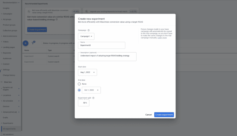 How it works. When you set up an experiment, you can test the recommendation without risking your main campaign’s performance. If the experiment is successful, you can apply the results by converting that experiment to a new campaign or transferring the experiment results to the original one.