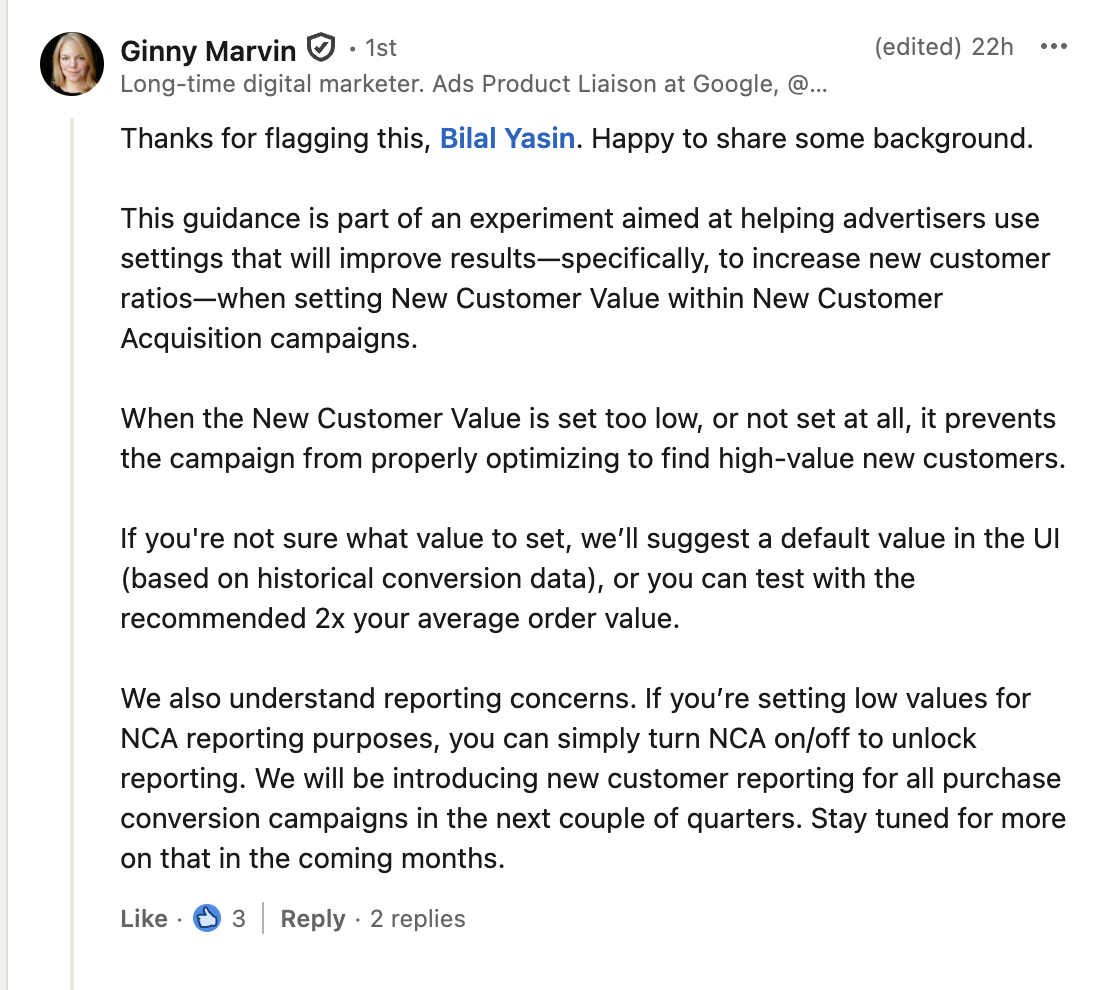 - “This guidance is part of an experiment aimed at helping advertisers use settings that will improve results—specifically, to increase new customer ratios,” Marvin wrote.