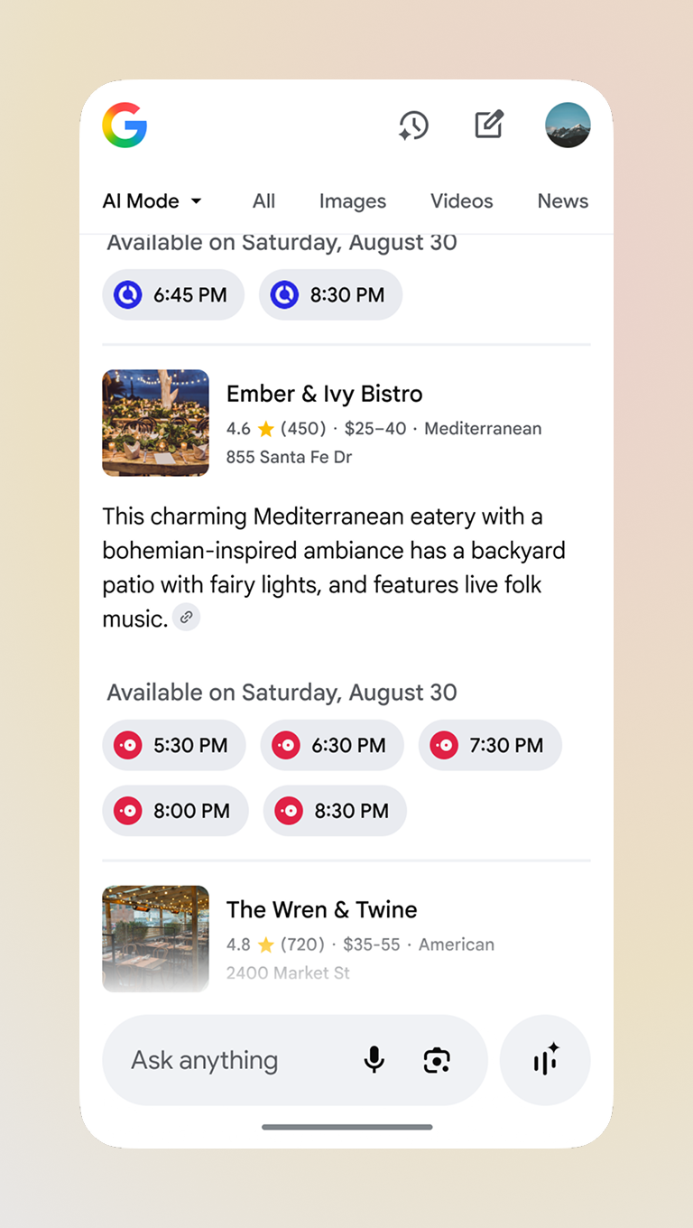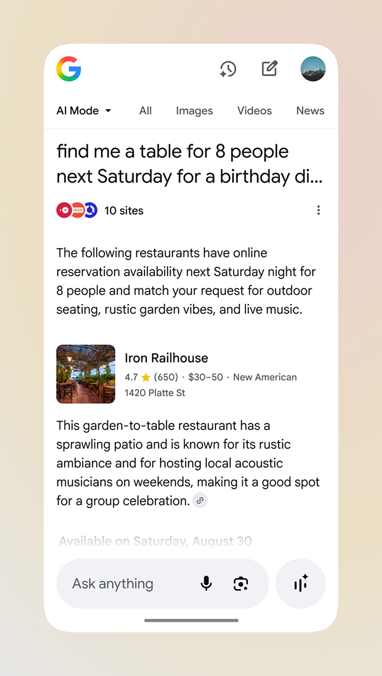Excited to be expanding access for this. Agentic capabilities in AI Mode for finding restaurant reservations are now available to all users opted into Labs in the U.S. Try it for yourself today.