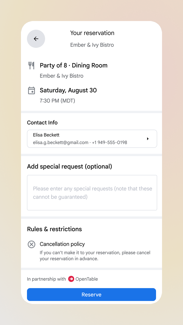 What it looks like. Here are some screenshots of the reservation booking Agentic experience in AI Mode: