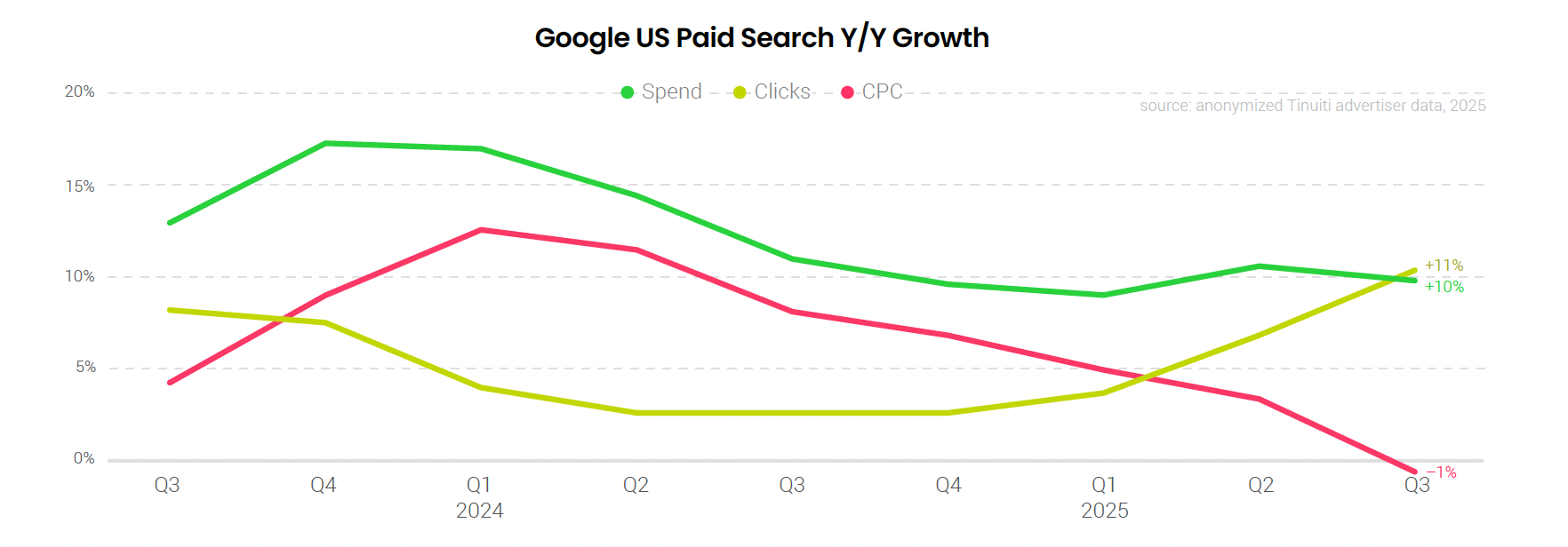 - Brand CPCs cooled from 19% growth in Q1 to 5% in Q3, while non-brand CPCs fell 7%.