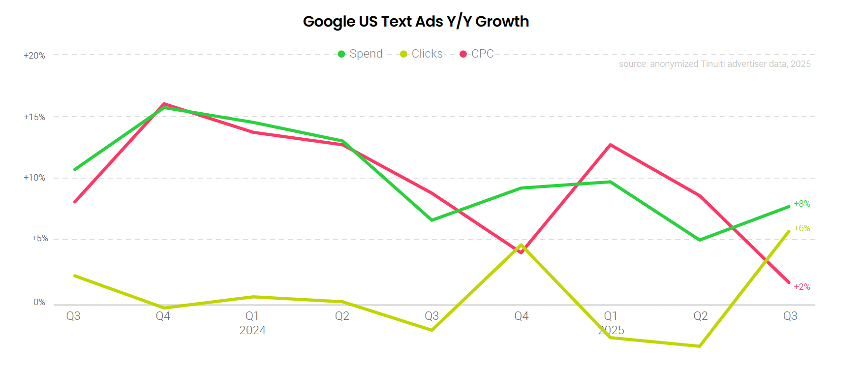 Text ads regain traction. Google text ads saw 8% year-over-year spend growth and a return to positive click volume after several slow quarters.