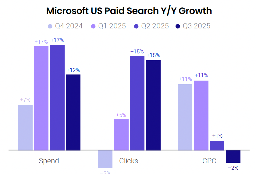 - Shopping ads surged: clicks up 15%, CPCs down 1%, spend up 14%.