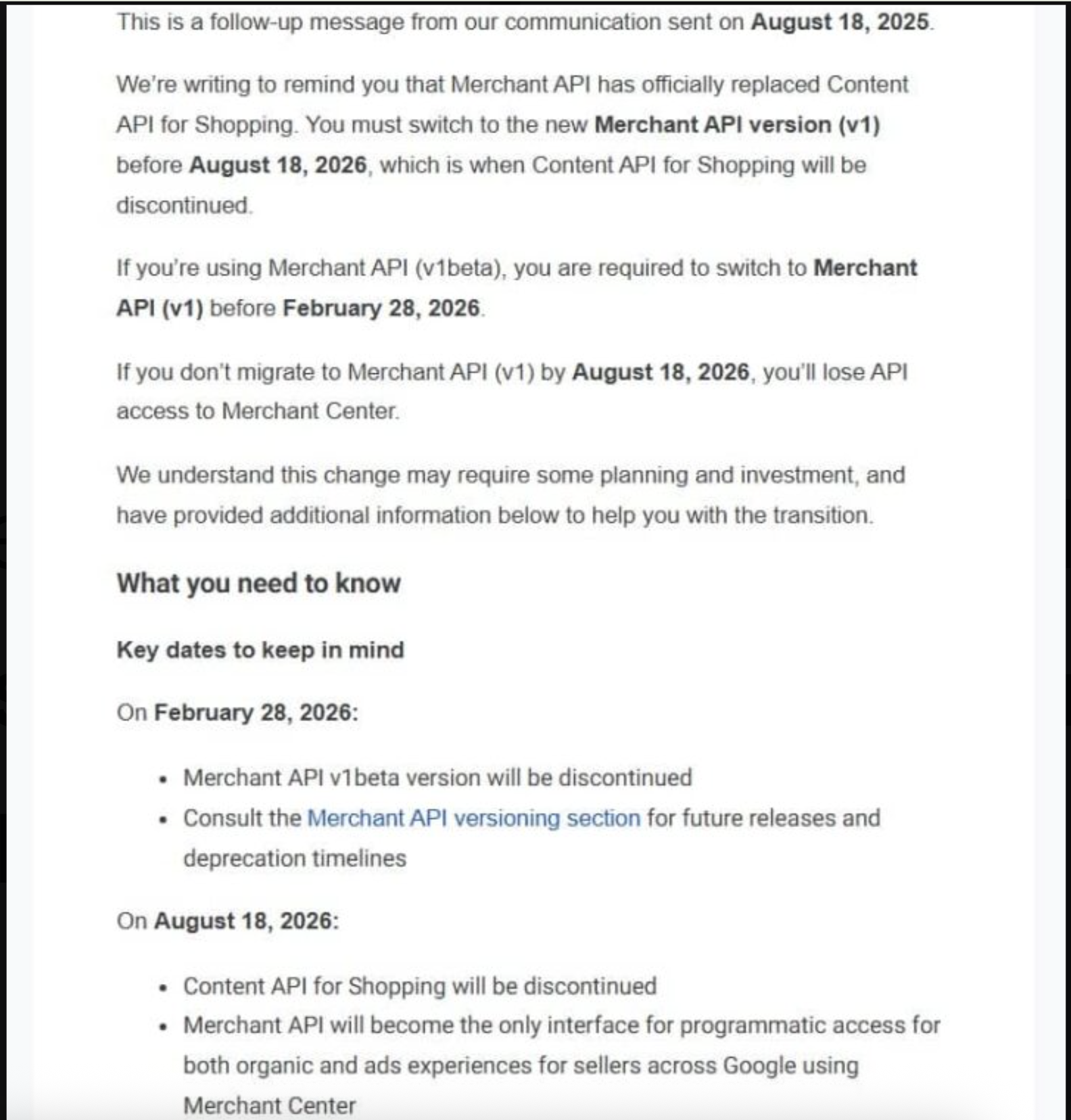 What to do now. Google recommends completing the migration well ahead of the deadline, reviewing feed labels, and validating campaign delivery after reconnecting feeds. The transition was first outlined in mid-2024, but enforcement is now imminent as Google moves closer to fully retiring legacy APIs.