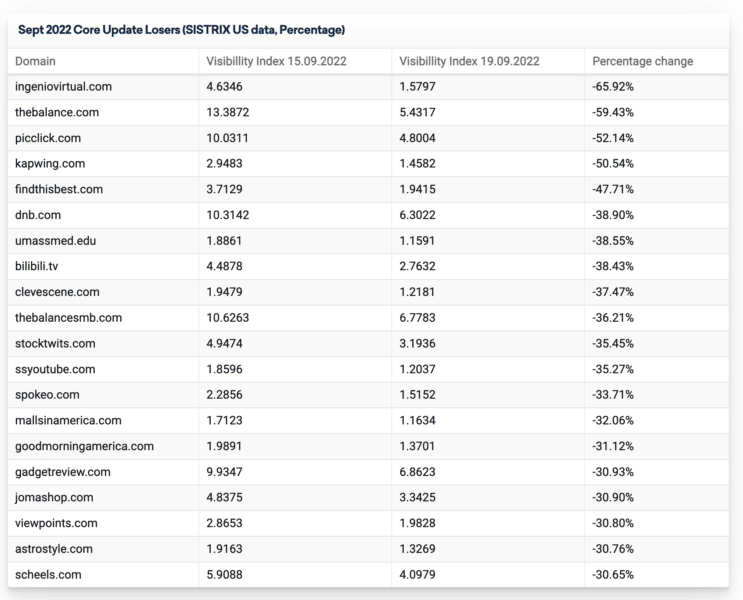 SISTRIX. SISTRIX, another data provider that tracks the changes in the Google search results, sent their top 20 winners and losers for the September 2022 core update. These are U.S.-based sites from Sistrix’s data set.