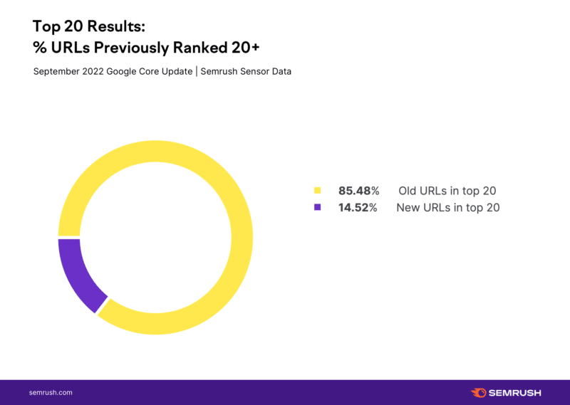 During this update, about 15% of the top twenty results consisted of URLs that were previously ranking in the top twenty positions. If you compare that to just over 17% and just over 16% during the May 2022 Core Update and November 2021 Core Updates respectively.