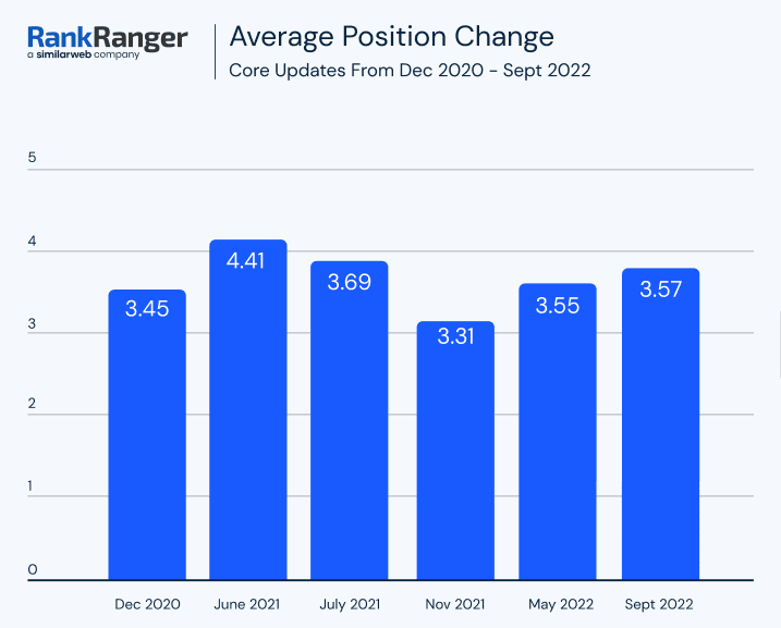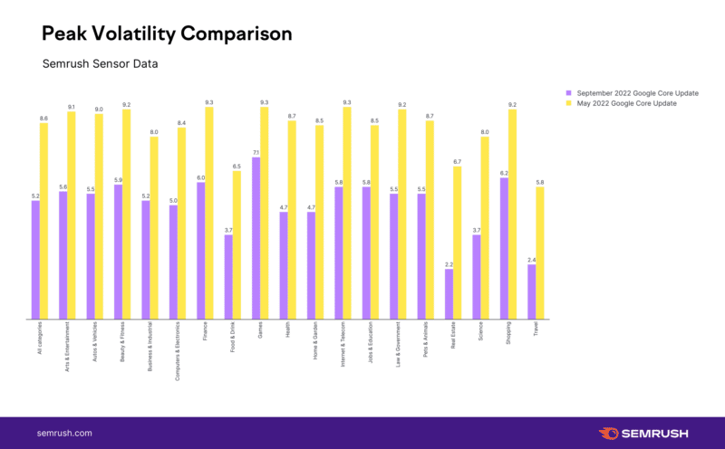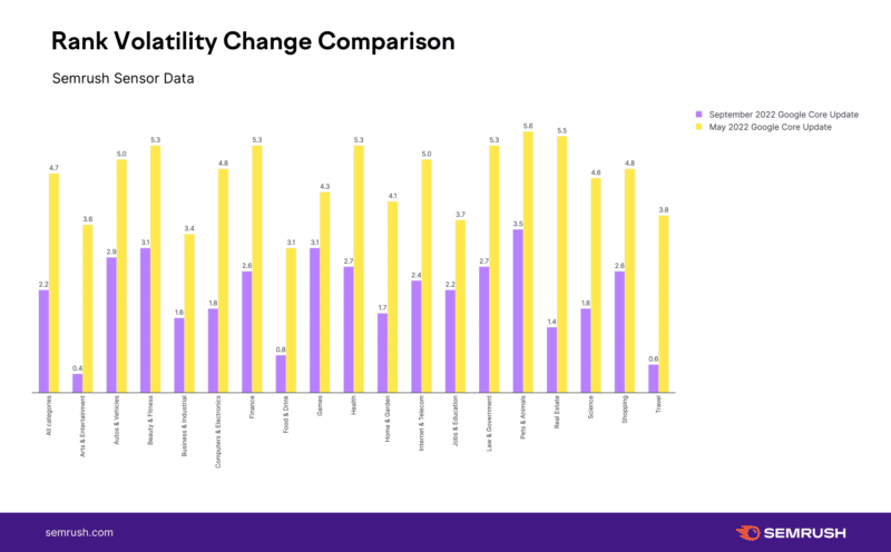 With the September 2022 core update, Semrush noticed rank volatility increases relative to pre-update volatility fall off 53% as compared to the May 2022 Core Update. “For context, the November 2021 Core Update increases in rank volatility were 19% more drastic than the May 2022 Core Update. In other words, May was already significantly weaker than the update that preceded it and the September 2022 Core Update has been significantly weaker overall than that,” Mordy explained.