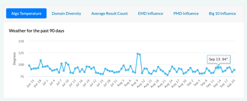 Semrush. Semrush data showed that the September 2022 core update hit pretty quickly after the announcement. In terms of its volatility tracker, as shown below (or you can view live at the Semrush Sensor tool). You can see, the sensor noticed a pick up in volatility on the 12 of September, which carried on through the 13th and started to dip down on the 14th.