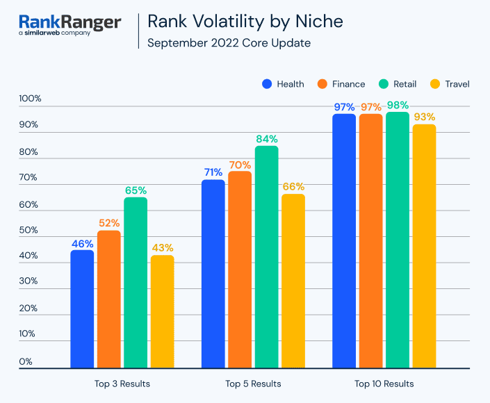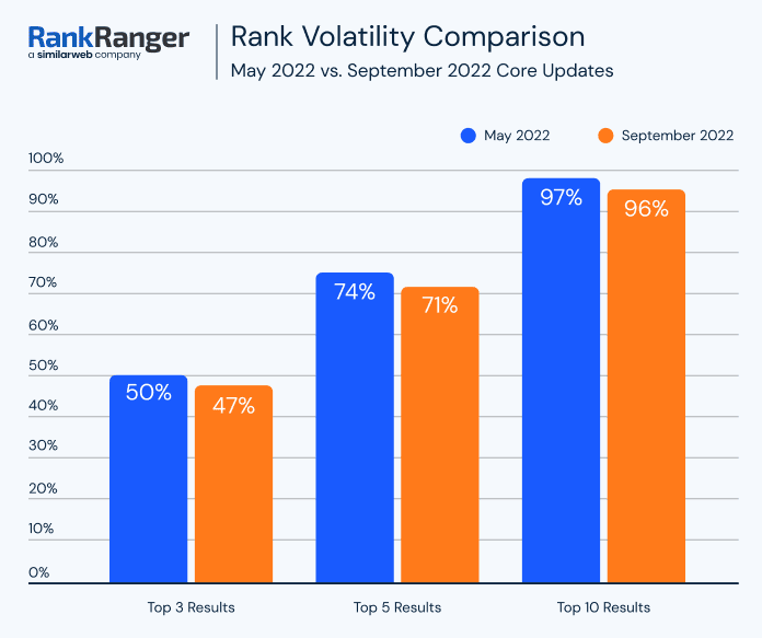 RankRanger noticed similar volatility between the September and May updates but said when you dig into the the top 3, top 5, and top 10 positions, you can see the September update showed fractionally less rank volatility than the May update.