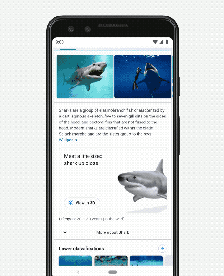 With new AR features in Search rolling out later this month, you can view and interact with 3D objects right from Search and place them directly into your own space, giving you a sense of scale and detail. For example, it’s one thing to read that a great white shark can be 18 feet long. It’s another to see it up close in relation to the things around you. So when you search for select animals, you’ll get an option right in the Knowledge Panel to view them in 3D and AR.