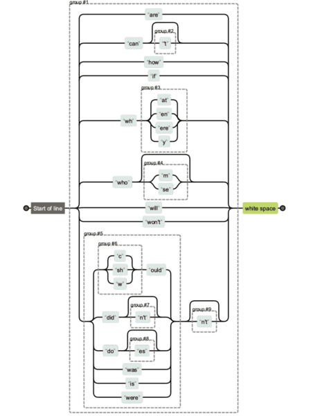 Regular expressions can get really complicated. If you’re getting a regex string from someone else and would like to disambiguate what is doing what, you can use Regexper to help you visualize it.