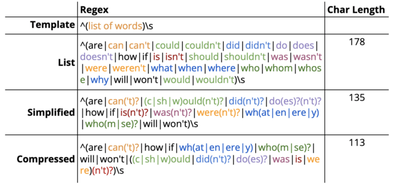 In the first column are the normal words and in the second column, the compressed regex.
