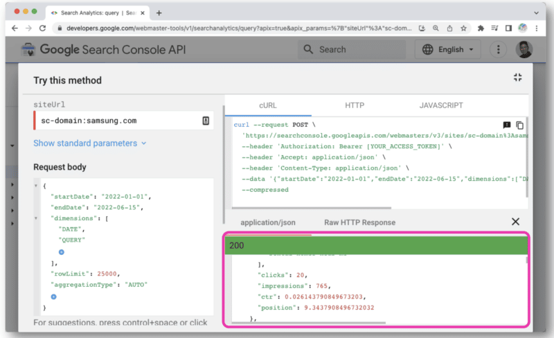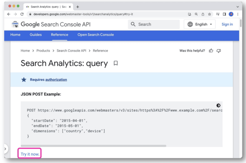 In the Google Search Console API documentation, there’s a Try it now link.