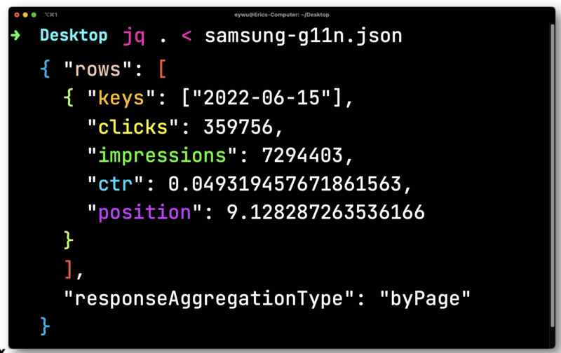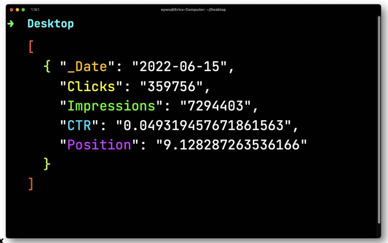 The response from Google is similar to that of the GSC API web view. The data can then be exported for processing.