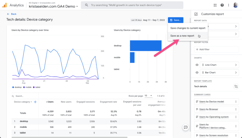 Step 3: Now, all you need to do is click the Save button and choose Save as new report. Give it a name like “Device category” to be clear – and that’s it!