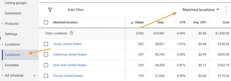 In the Locations tab, you can drill down performance by: