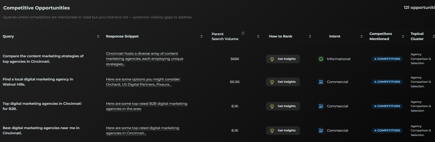 - Missing content: Competitors are cited because they cover topics you haven’t addressed. This represents a content gap to fill.