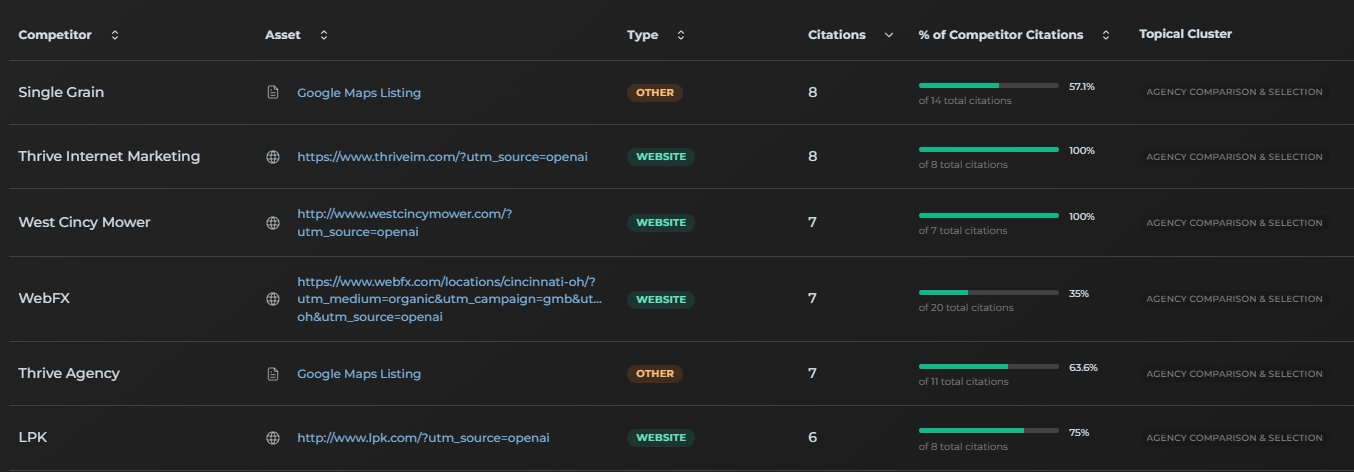 - What types of competitor content are being cited (case studies, FAQs, research articles, etc.).