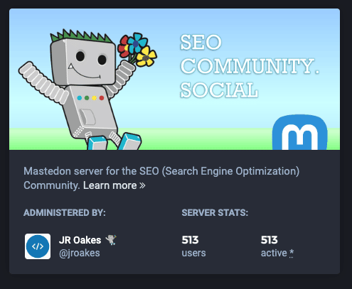 Mastodon is seeing a huge influx of new users so it may be challenging to find a good server to join. There are a few rapidly growing, dedicated and popular SEO community servers already up and running.