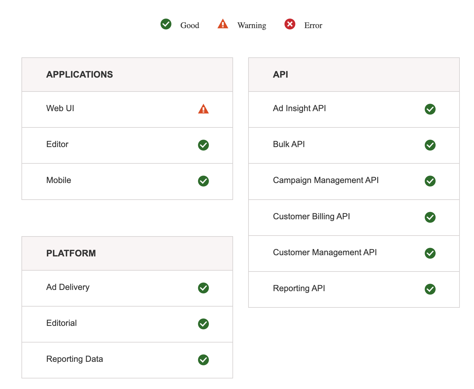 How to check the status. You can go to status.ads.microsoft.com to check the status of Microsoft Advertising. It currently shows that the Web UI is down: