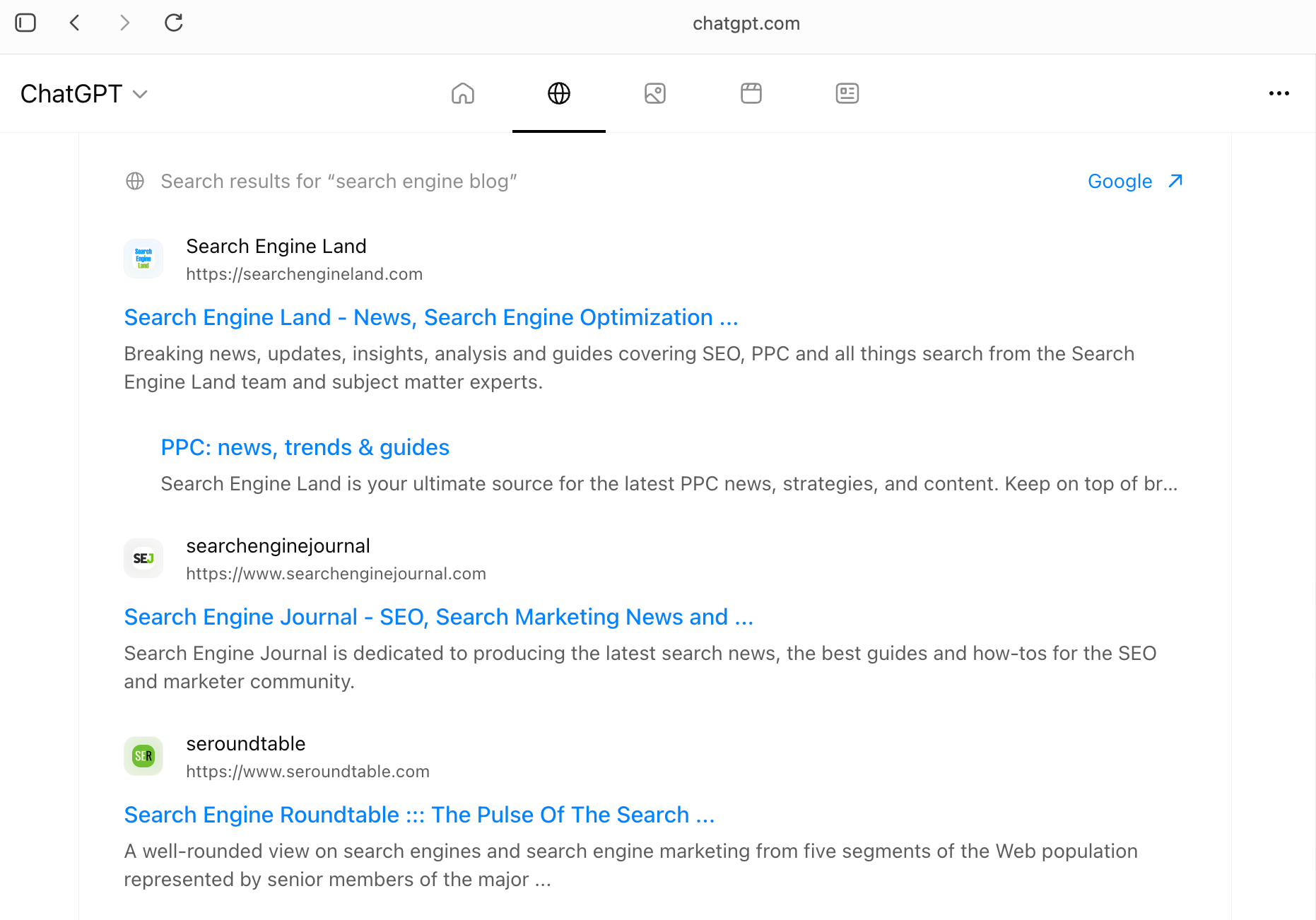 Search in Atlas. The interesting thing is that when you search in ChatGPT Atlas, it gives you a ChatGPT like response but also adds search vertical tabs to the top, like you have in other search engines. Like web, images, videos, news and more. Then when you go to those tabs, there is a link at the top of each set of search results to Google.