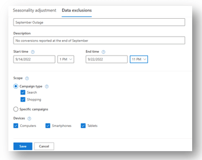 Using the tool, you can inform Microsoft Advertising of the specific date, time, scope, and devices related to the conversion tracking errors or outages so that the erroneous conversion data can be excluded in optimizations. Start by selecting Tools > Bid Strategies > Advanced controls > Data exclusions.
