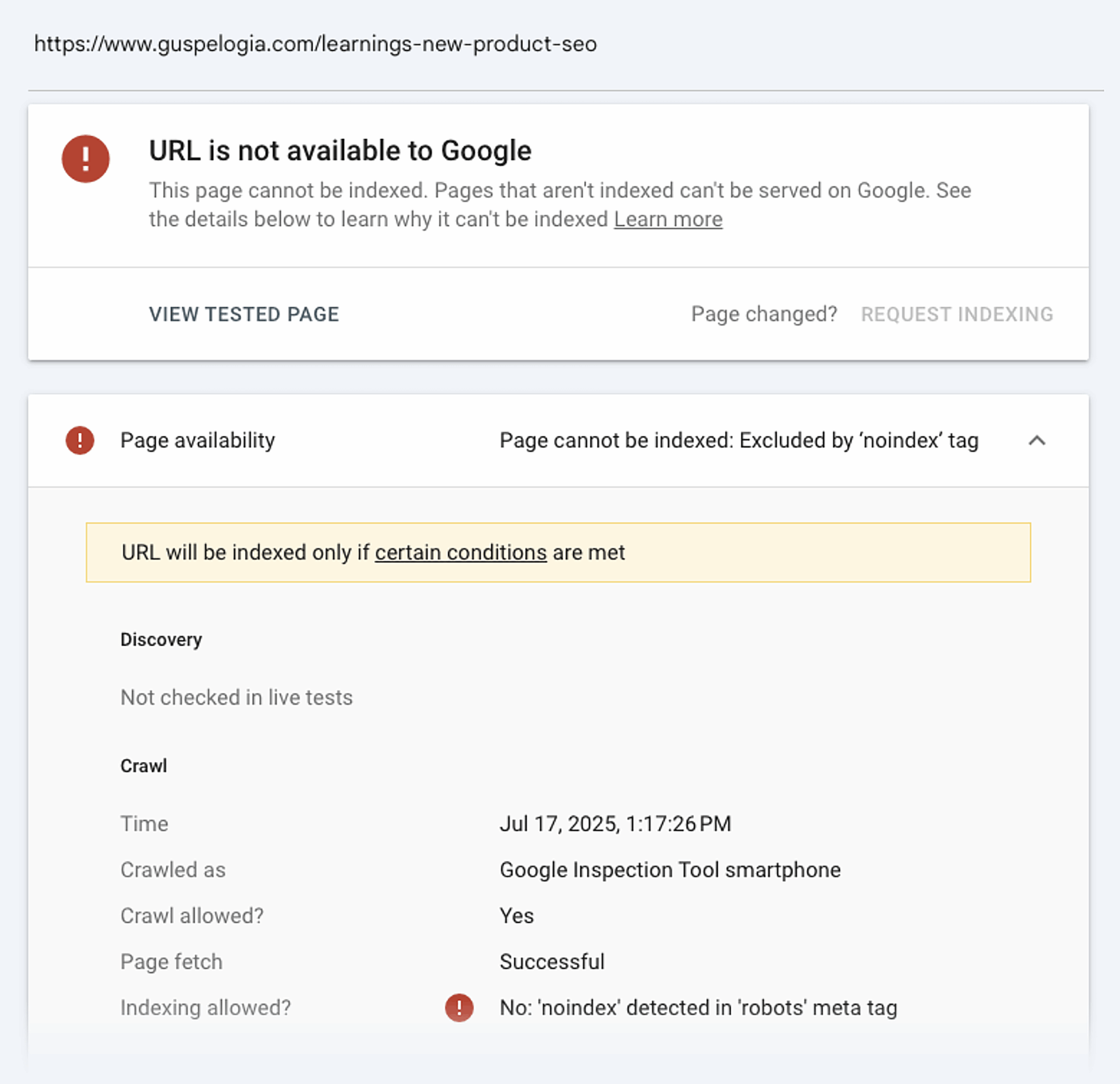 GSC shows that it can’t index the page due to “noindex” tag