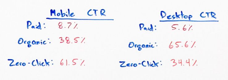 The click-through rates look something like this. For mobile devices, on average, paid results get 8.7% of all clicks, organic results get about 40%, a little under 40% of all clicks, and zero-click searches, where a searcher performs a query but doesn’t click anything, Google essentially either answers the results in there or the searcher is so unhappy with the potential results that they don’t bother taking anything, that is 62%. So the vast majority of searches on mobile are no-click searches.