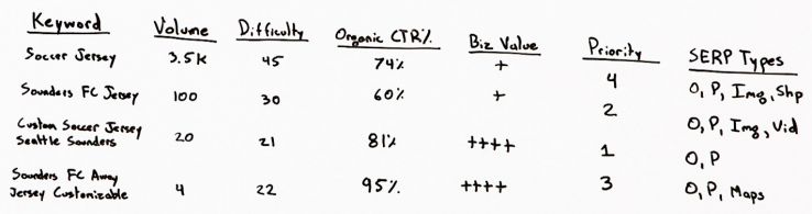 - Then set some type of priority to determine. So I might look at this list and say, “Hey, for my new soccer jersey website, this is the most important keyword. I want to go after “custom soccer jersey” for each team in the U.S., and then I’ll go after team jersey, and then I’ll go after “customizable away jerseys.” Then maybe I’ll go after “soccer jerseys,” because it’s just so competitive and so difficult to rank for. There’s a lot of volume, but the search intent is not as great. The business value to me is not as good, all those kinds of things.