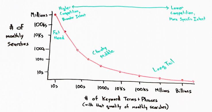 Then this fat head has only a few keywords. There’s only one keyword like “soccer” or “soccer jersey,” which is actually probably more like the chunky middle, but it has hundreds of thousands or millions of searches. The fat head is higher competition and broader intent.