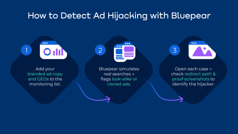 Platforms like Bluepear simulate real user behavior across geographies and devices to uncover hidden ads, decloak affiliate landing pages, trace redirect chains, and compile full evidence packs – screenshots, keywords, affiliate IDs.