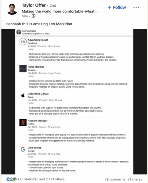Len Markidan is a good marketer and a nice guy with a funny sense of humor. Nowhere was that more apparent than when he updated his LinkedIn profile to satirically point out how he “worked” at various social platforms because they’re all, frankly, stealing his data. (More on this in the next tip below.)