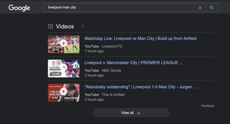 As an example, type in a recent sporting event that just ended, like Liverpool (the good guys) vs. Man City (the bad guys), and you’ll immediately get YouTube suggestions including highlights, interviews, post-match reactions, and more.