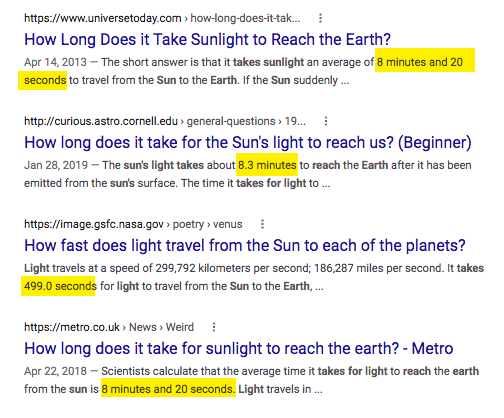 Even though the results use slightly different wording – 499 seconds is the same as 8 1/3 minutes for example – there is a general consensus that this is a true fact. Google can likely feel comfortable that this answer is correct and therefore can feel confident in displaying it as a featured snippet callout.