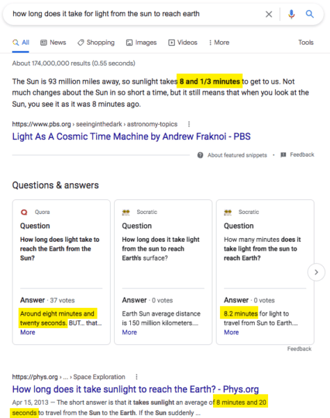 In the example given, if a searcher asks. “how long does it take for light from the sun to reach earth”, the featured snippet callout would be “8 and 1/3 minutes.”